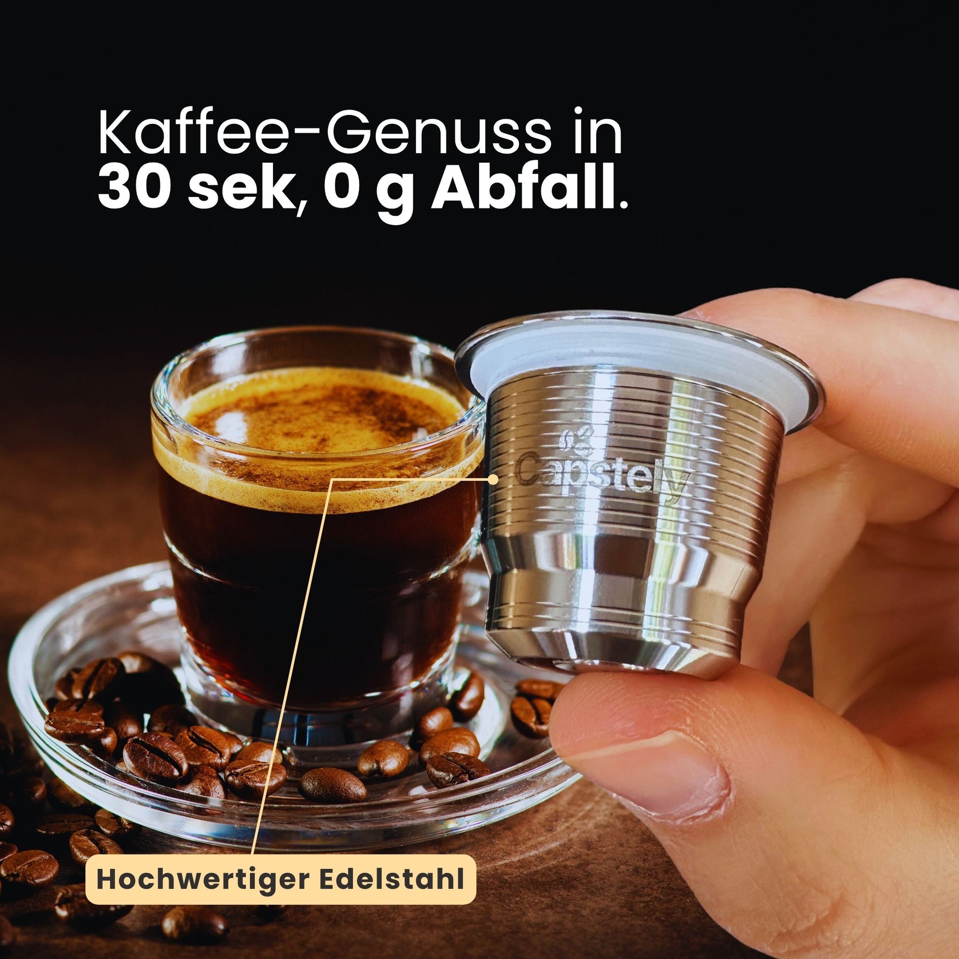 Unsere Capstely™ Edelstahlkapsel kostet im Basis-Set einmalig 29,99 € (bei anderen Sets günstiger) und hält bei richtiger Anwendung viele Jahre. Dann brauchst du nur noch deinen Lieblingskaffee – der kostet je nach Sorte meist 10–25 € pro Kilo (ca. 0,10 € pro Tasse).